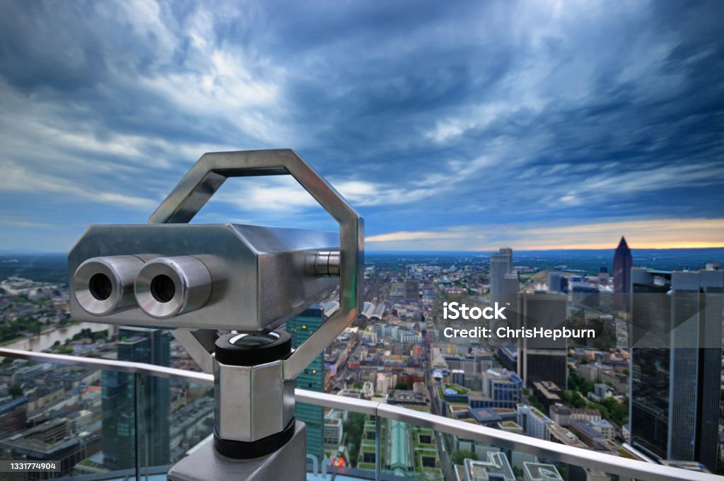 Wide angle aerial view of Frankfurt at sunset, Germany, Europe